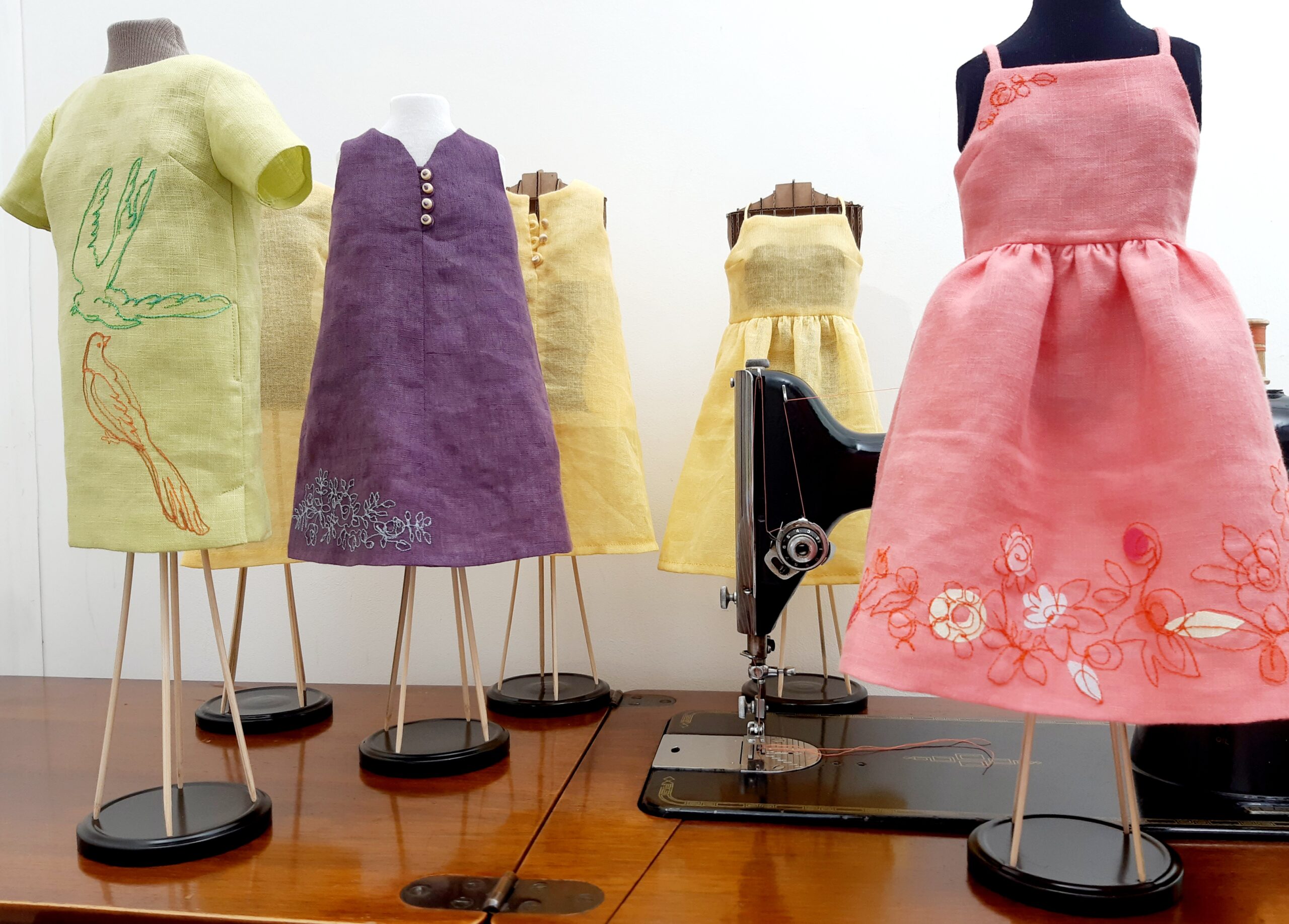 Embroidered linen dresses named after designers who took part in Le Theâtré de la Mode in Paris in 1945 … ‘Jean’, ‘Nina’ and ‘Madelaine’.